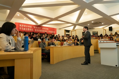 12月2日,政府审计学院在敏行楼101举办了”师友同行”系列活动——信息系统核查项目工作经验分享。本次活动邀请了毕马威中国区信息技术风险和鉴证服务主管合伙人兼北方区IT咨询主管合伙人董常凌。董常凌先生就职于毕马威北京办公室,在信息技术咨询和审计以及数据尽调等领域有多年的从业经验。本次讲座由李兆东副院长主持,周维培院长、部分教师代表以及学院大数据审计方向的学生出席了活动。