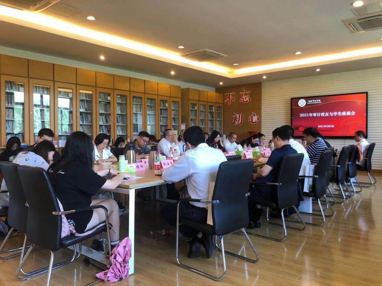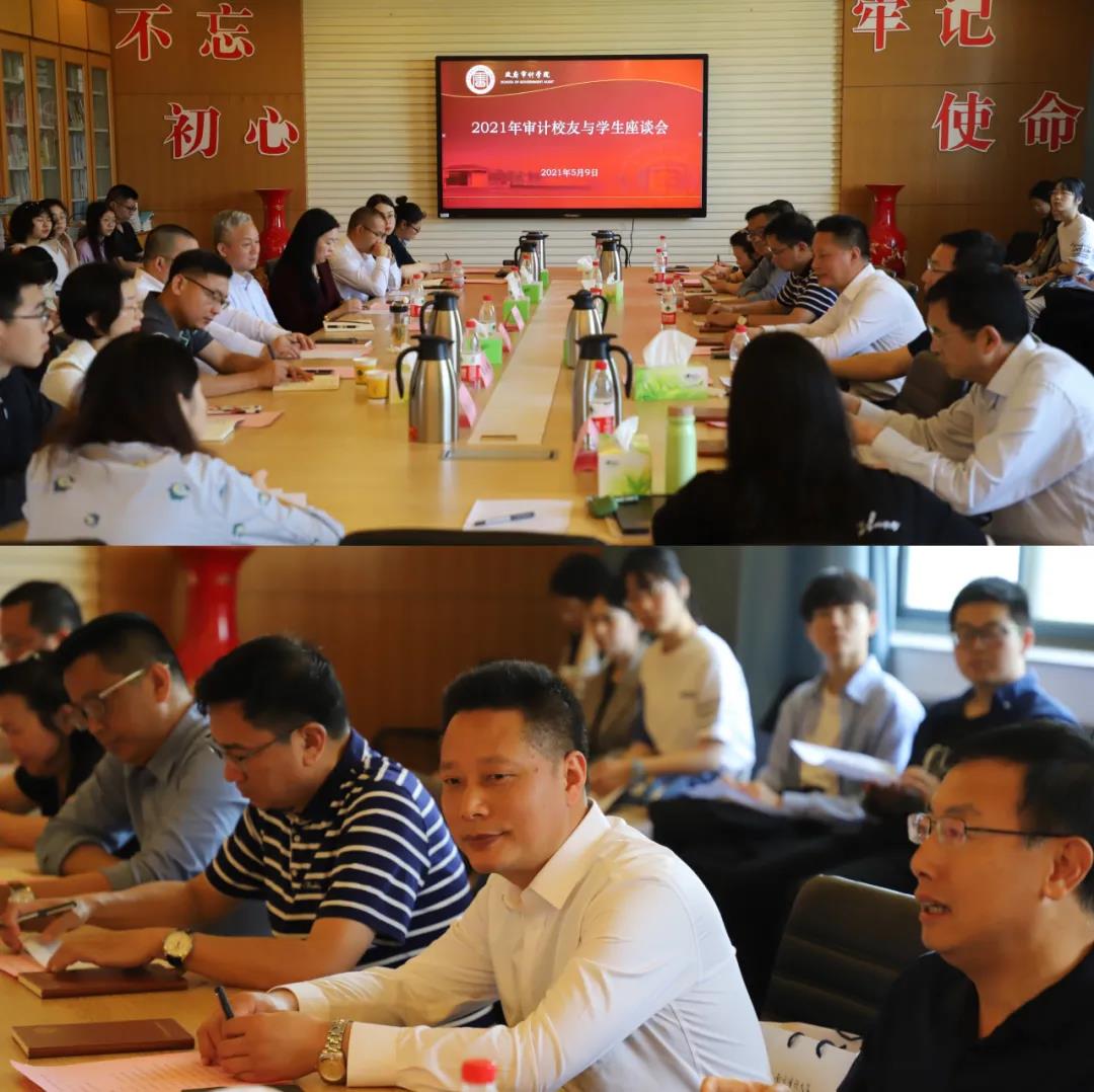 5月9日上午,政府审计学院2021年审计校友与学生座谈会在敏行楼四楼会议室召开。13位来自各行各业的杰出校友回到学院给学弟学妹们传经送宝。政府审计学院党委书记童瑞连、副院长王士红以及师生代表40多人参加座谈会。