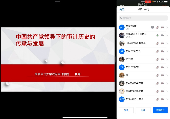 接下来她讲解了新时代国家审计的创新与发展。党的十九大以来,党中央将审计作为党和国家监督体系的重要组成部分,做出一系列重大决策部署,例如加强党对审计工作的领导、改革审计管理体制、进一步拓展审计监督业务范围等。她总结到,依托中国高速发展的经济背景和不断完善的社会制度,尤其是在以习近平总书记为中心的中国共产党领导下,当代中国的审计事业已经形成了富有中国特色的审计制度,在中国社会经济发展过程中起到了举足轻重的作用,在国际上也有较高的地位和影响力。