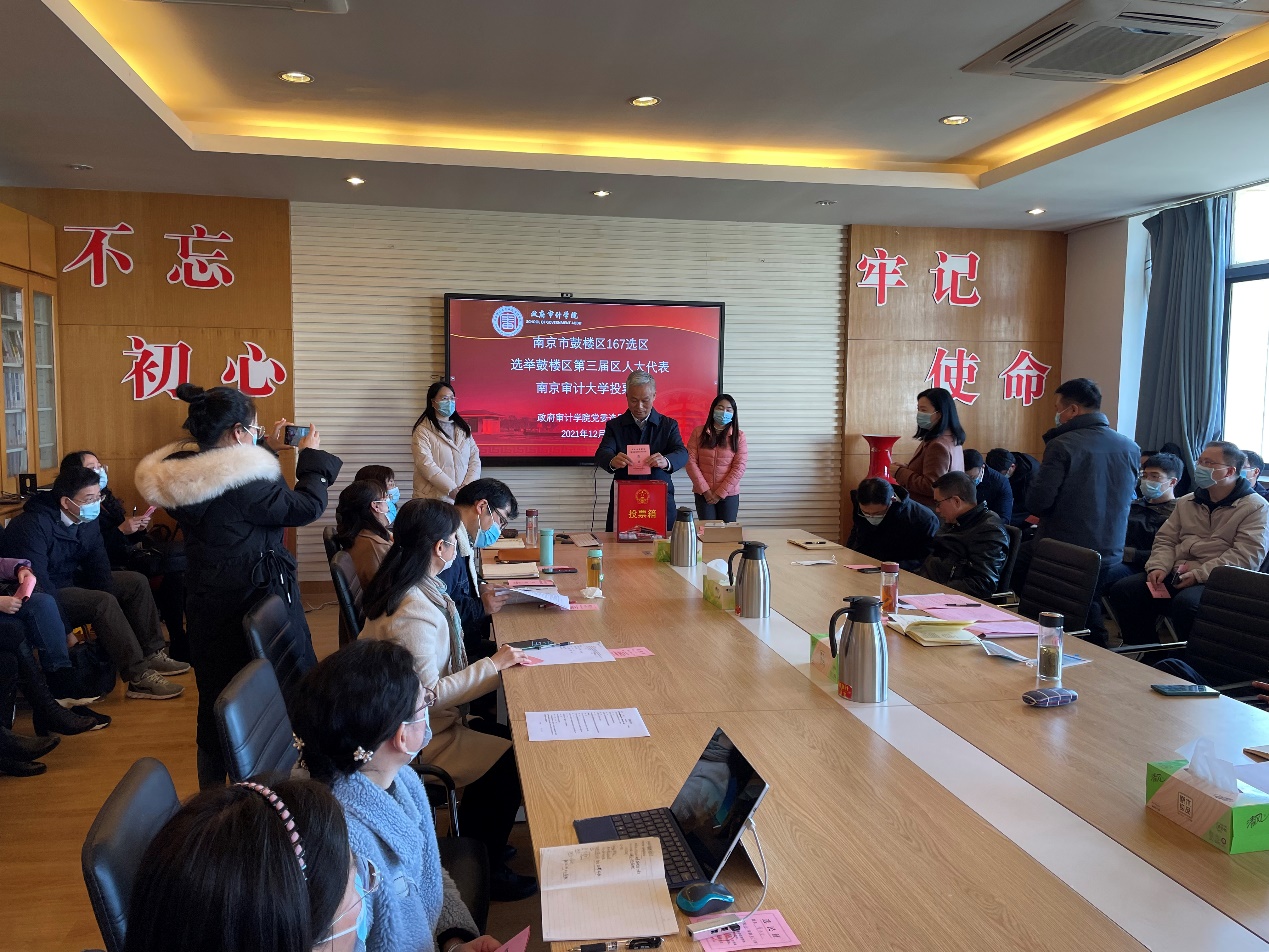 政府审计学院选民小组共设3个投票站,应参加投票选民438人,其中教工选民86人,研究生选民352人。各位选民在选举工作人员的导引下,严格遵循投票程序,认真填写选票,前往投票箱投下自己神圣庄严的一票,依次离场。整个投票选举过程严谨规范,严格执行疫情防控相关规定,投票选举工作顺利完成。