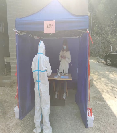 (图为辅导员接到通知后着防护服前往留观点指导演练患者)