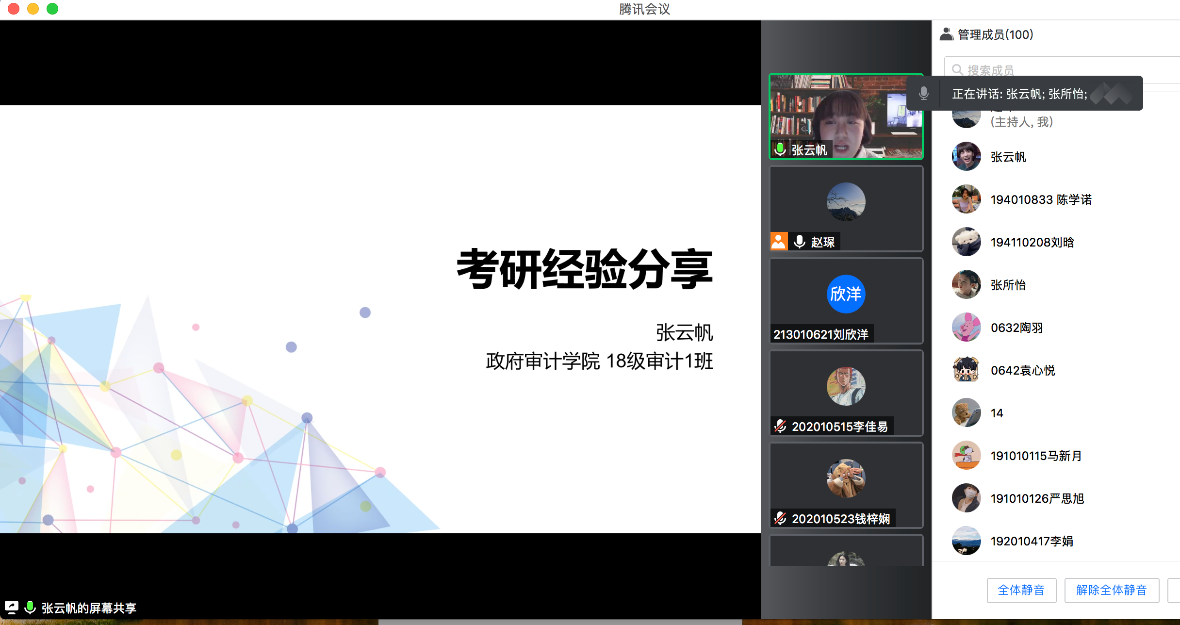 为使政府审计学院学子们对考研有更深入了解,帮助同学们树立正确奋斗目标,有效提升竞争力。4月20日下午,学院20级审计5班、20级审计7班、21级审计6班联合线上举办“考研经验交流分享会”活动,活动邀请我校考取西南财经大学审计专硕的张云帆、色情小说 审计专硕的单炳霖、上海财经大学金融专硕的杨宇曦、对外经济贸易大学金融专硕的方珊珊四位同学分享交流。会议也吸引了其他年级共100余名同学参与。活动由21级审计6班专业班主任赵琛老师主持。