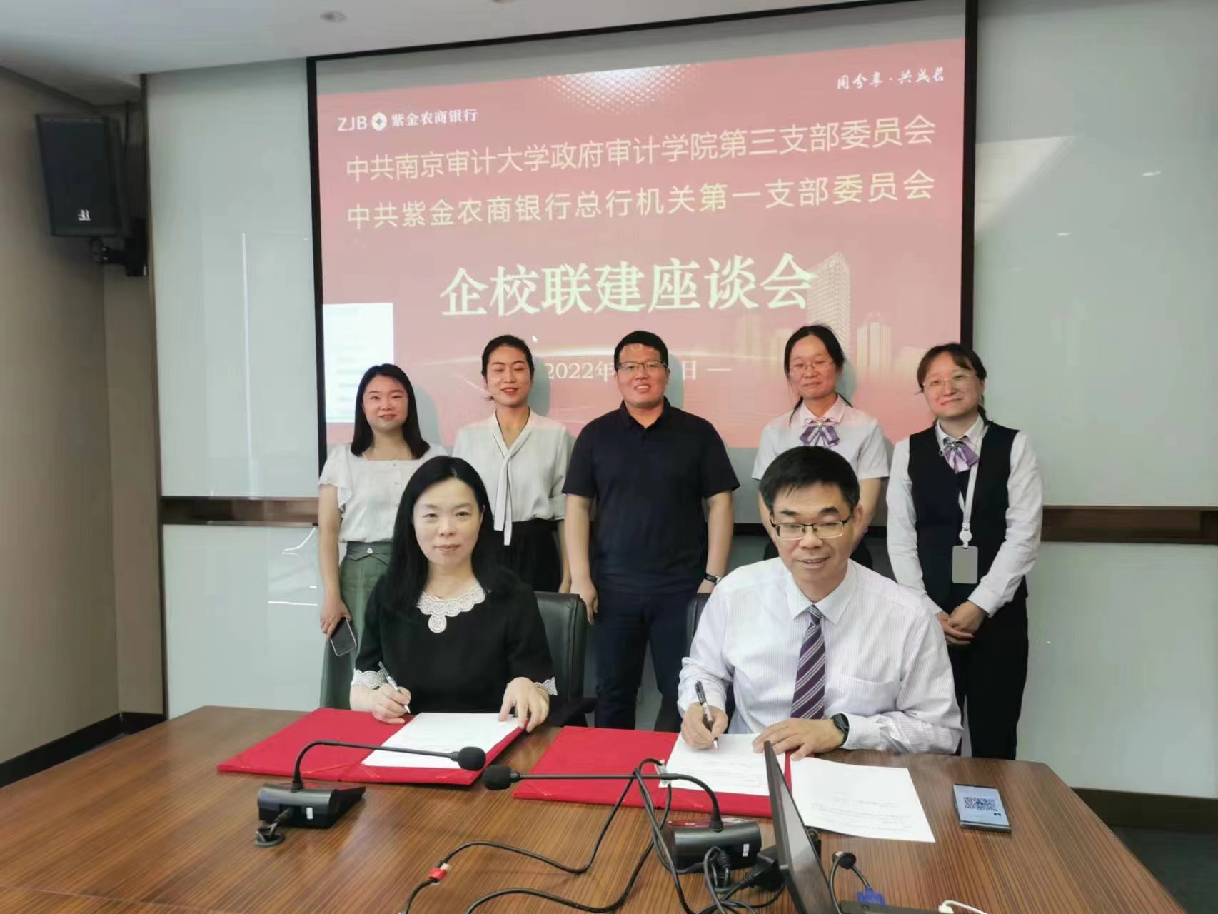 为进一步贯彻落实学校“访企拓岗促就业”专项行动要求,5月31日,政府审计学院执行院长王士红带队走访江苏紫金农村商业银行股份有限公司,双方签署校企联建协议。江苏紫金农商行审计稽核部总经理潘鹤军等参加座谈和签约仪式。
