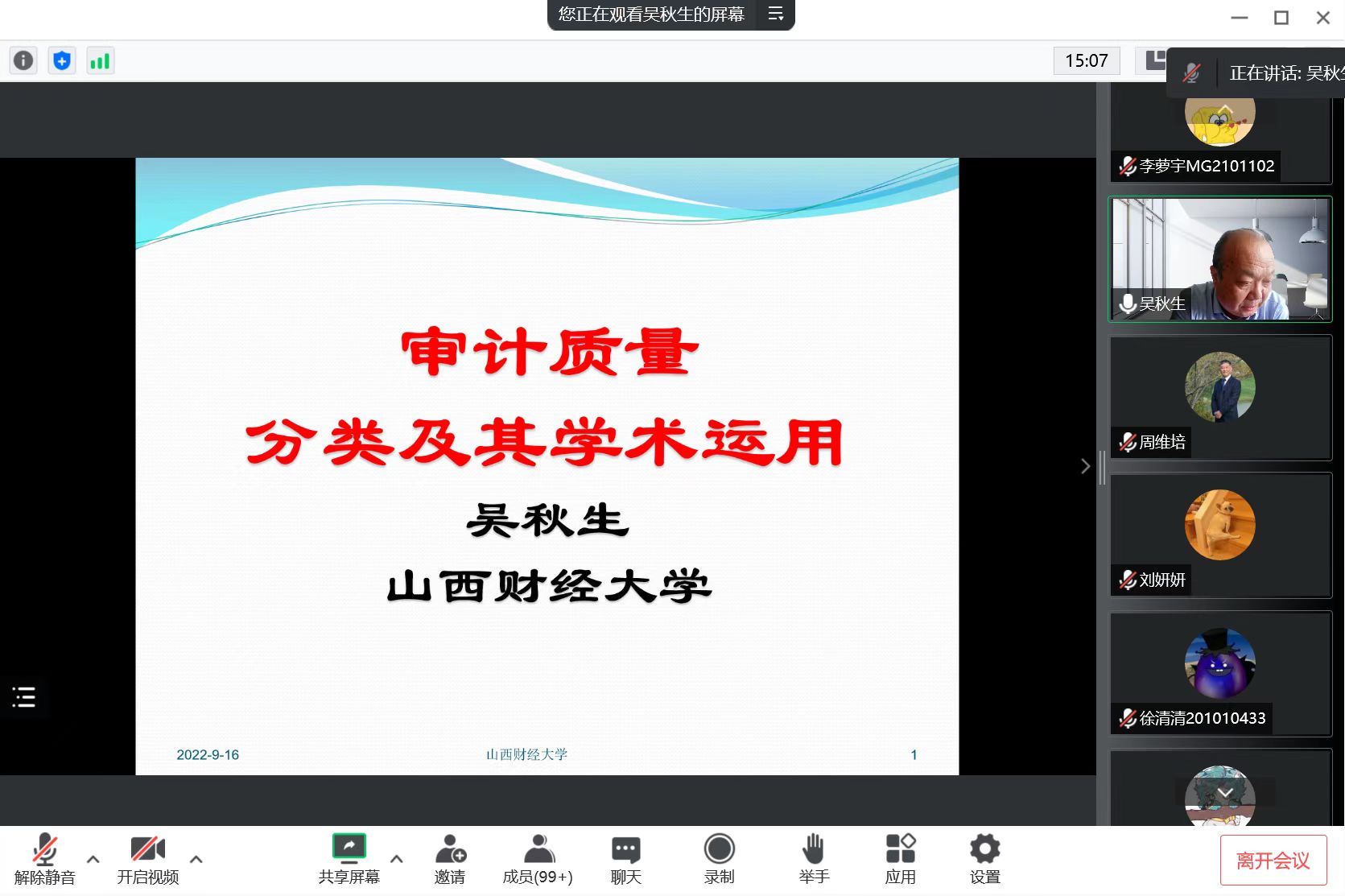 9月16日下午,政府审计学院在线上举办第133期 “审计名家讲坛”,邀请山西财经大学吴秋生教授作主题为“审计质量分类及其学术运用”的学术讲座。政府审计学院院长周维培教授主持讲座,200余位师生聆听了此次讲座。