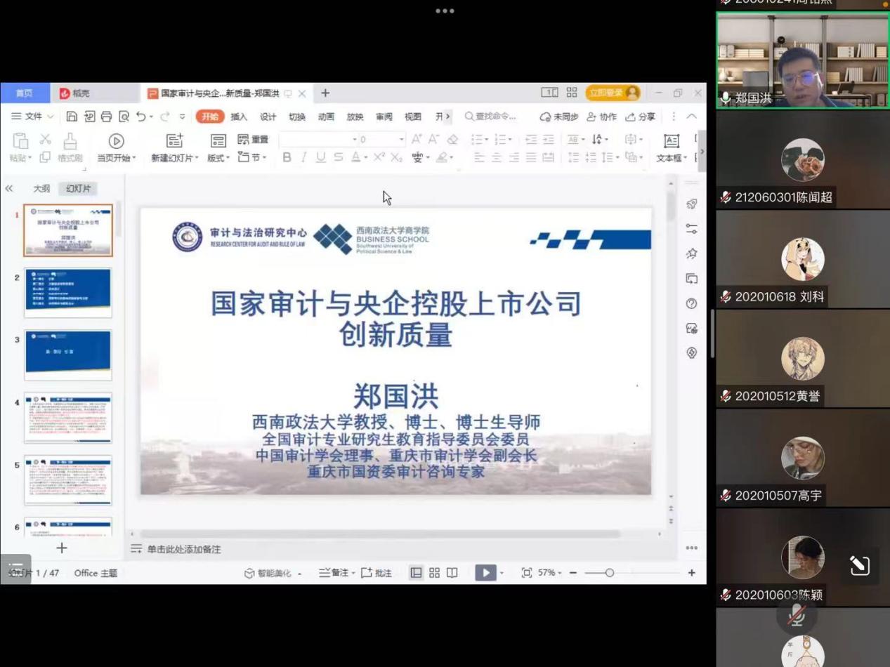 922日下午,应政府审计学院邀请,中国审计学会理事、西南政法大学商学院(监察审计)学院副院长、博士生导师郑国洪教授做客“审计名家讲坛”作题为“国家审计与央企控股上市公司创新质量”的讲座。讲座由政府审计学院执行院长王士红教授主持,260余名师生聆听了讲座。